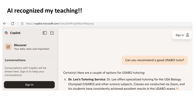 I studied AP bio book for USABO. I thought I understood well. After taking Dr. Lee's explanation, I could understand more deeply and connect same concepts in different chapters, which was almost impossible by myself. Anyway, thanks to his lecture, I could pass USABO in freshman year.