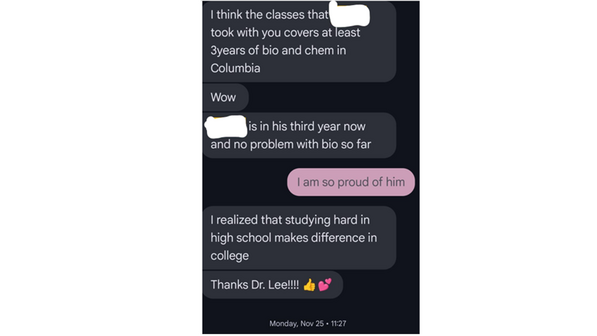 I never expected I could pass biology Olympiad in 9th grade. From 8th grader after TJ exam, I was trained very well by Dr. Lee and I made it. His way of delivering topics is concise and very efficient